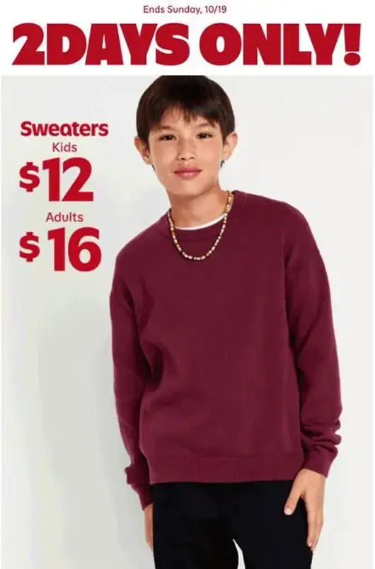 Don't miss out! Shop in store and get adults' sweaters for $16 & $12 for kids.